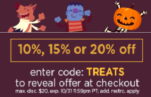 Use promo code “TREATS” on almost any LivingSocial purchase. Percentage discount varies between 10%, 15%, and 20% and will be revealed after applying the promo code to your purchase, prior to final checkout.
