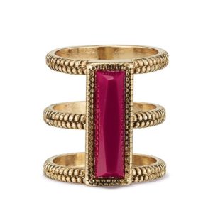 The look of three rings in one! The antique goldtone triple row ring has a large dark red stone connecting the three rings for a three ring look.
